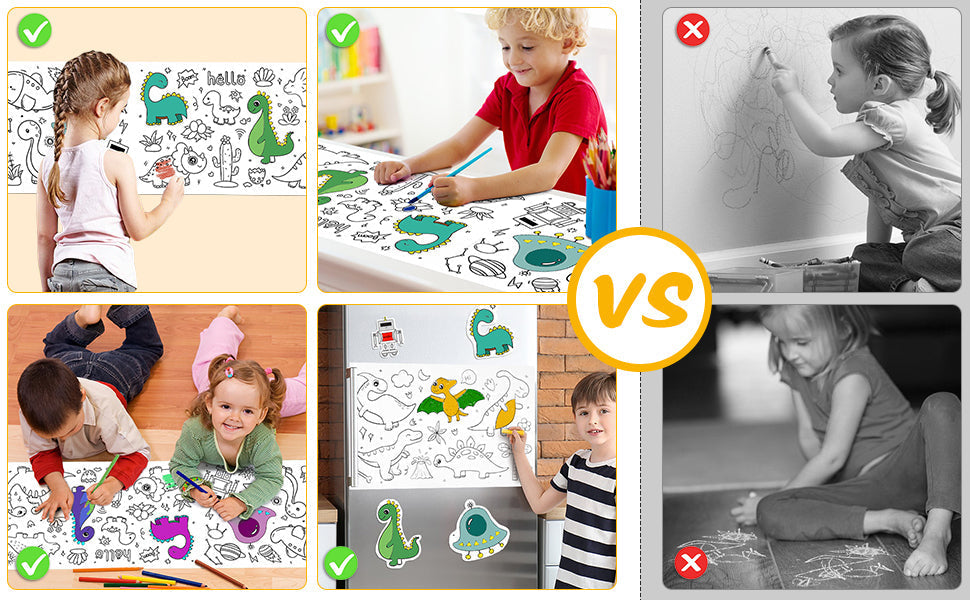 🖍️How to Use? — Kids can stick this drawing roll on walls, furniture, desks, floors or anywhere they want to create. And you can easily cut out the pattern on the scroll. Specially designed back sticker will not leave any marks on the wall and will not damage your wall.
